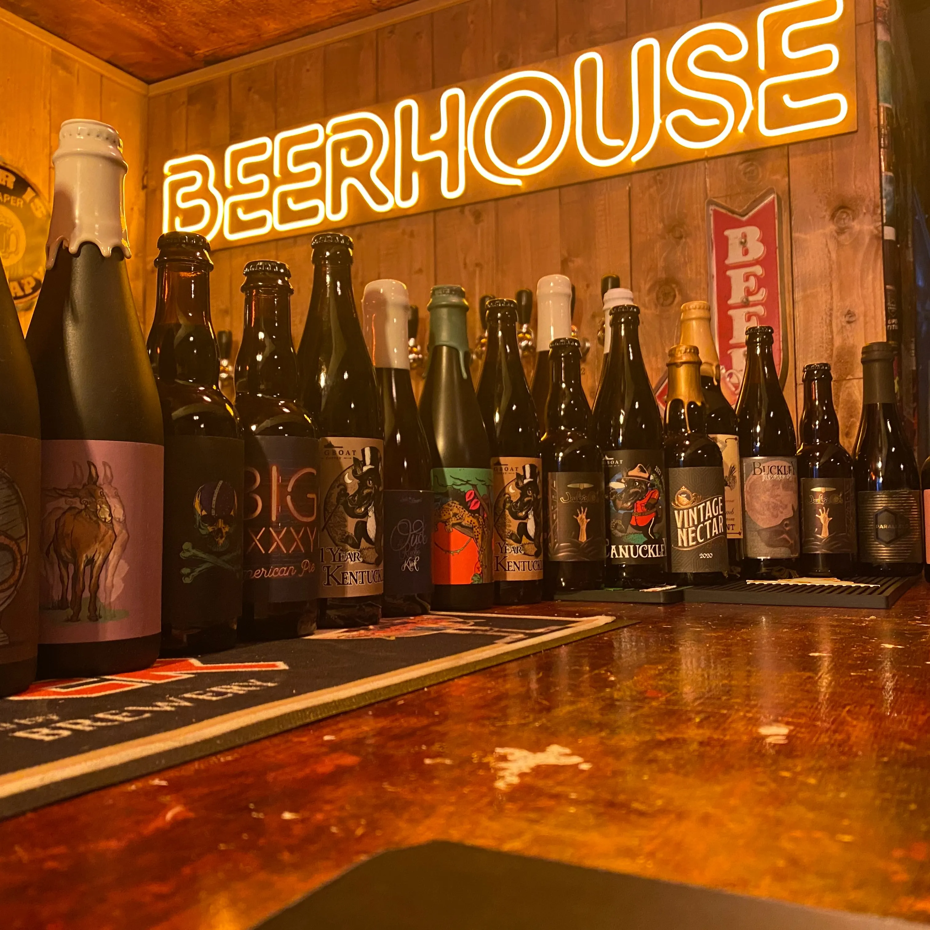 La imagen muestra una colección de varias botellas de cerveza sobre una superficie de madera. En el fondo, hay un letrero de neón que dice “BEERHOUSE”. Un bar especializado en cervezas artesanales.