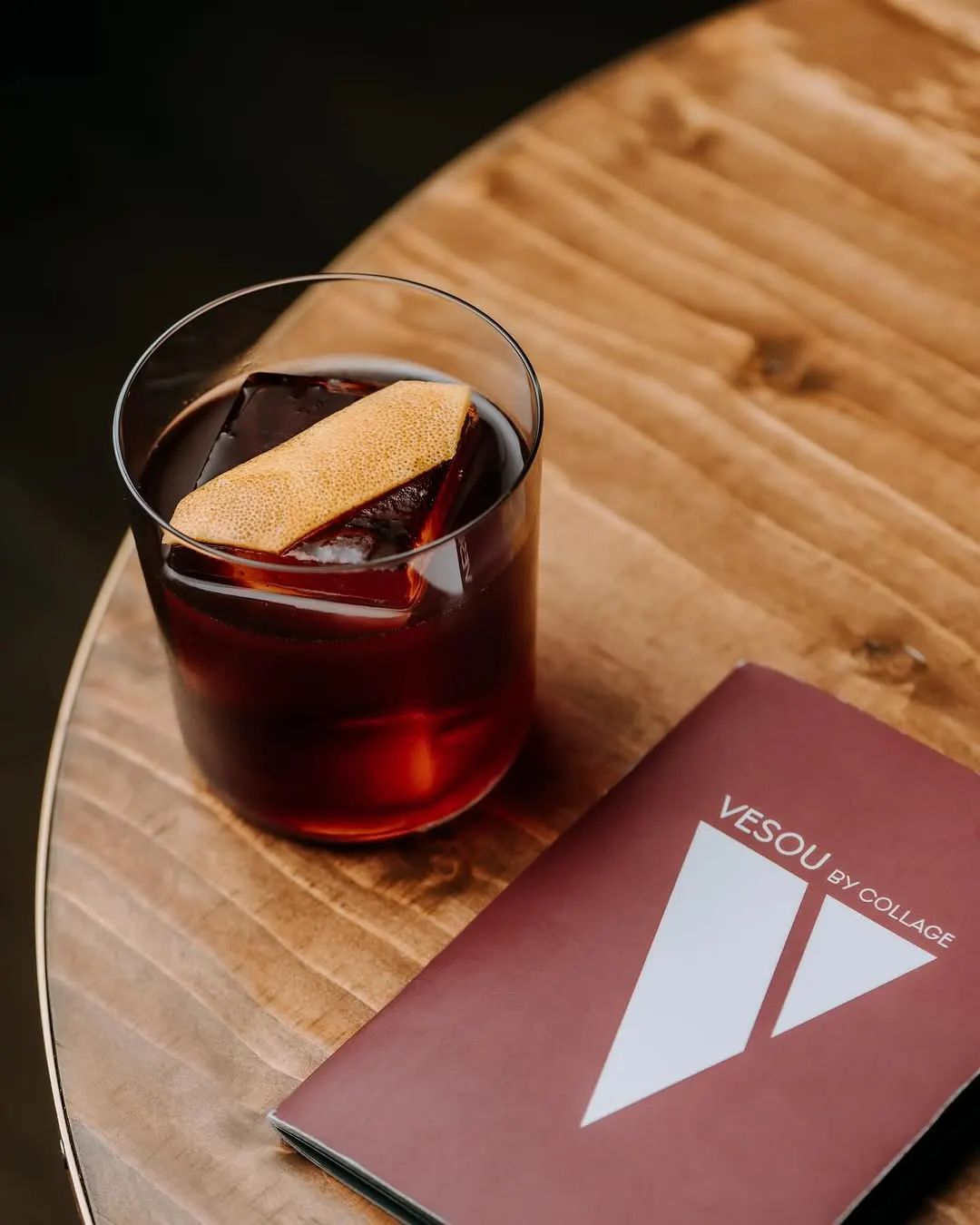 Un vaso de cóctel con hielo y una rodaja de naranja sobre una mesa de madera, junto a un menú de la coctelería Vesou by Collage, en un ambiente relajado.
