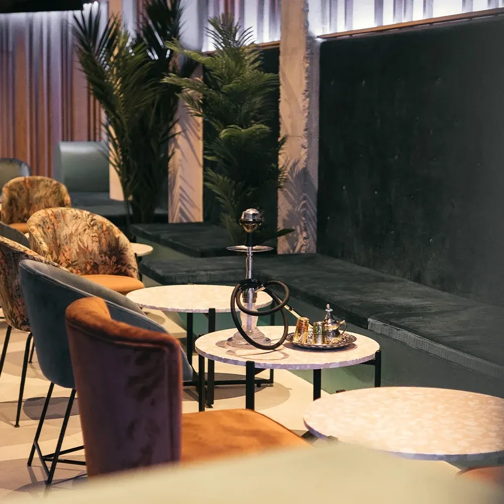 Habibi Shisha Lounge presenta un diseño sofisticado con sillones aterciopelados, mesas elegantes y una iluminación cálida para relajarse.