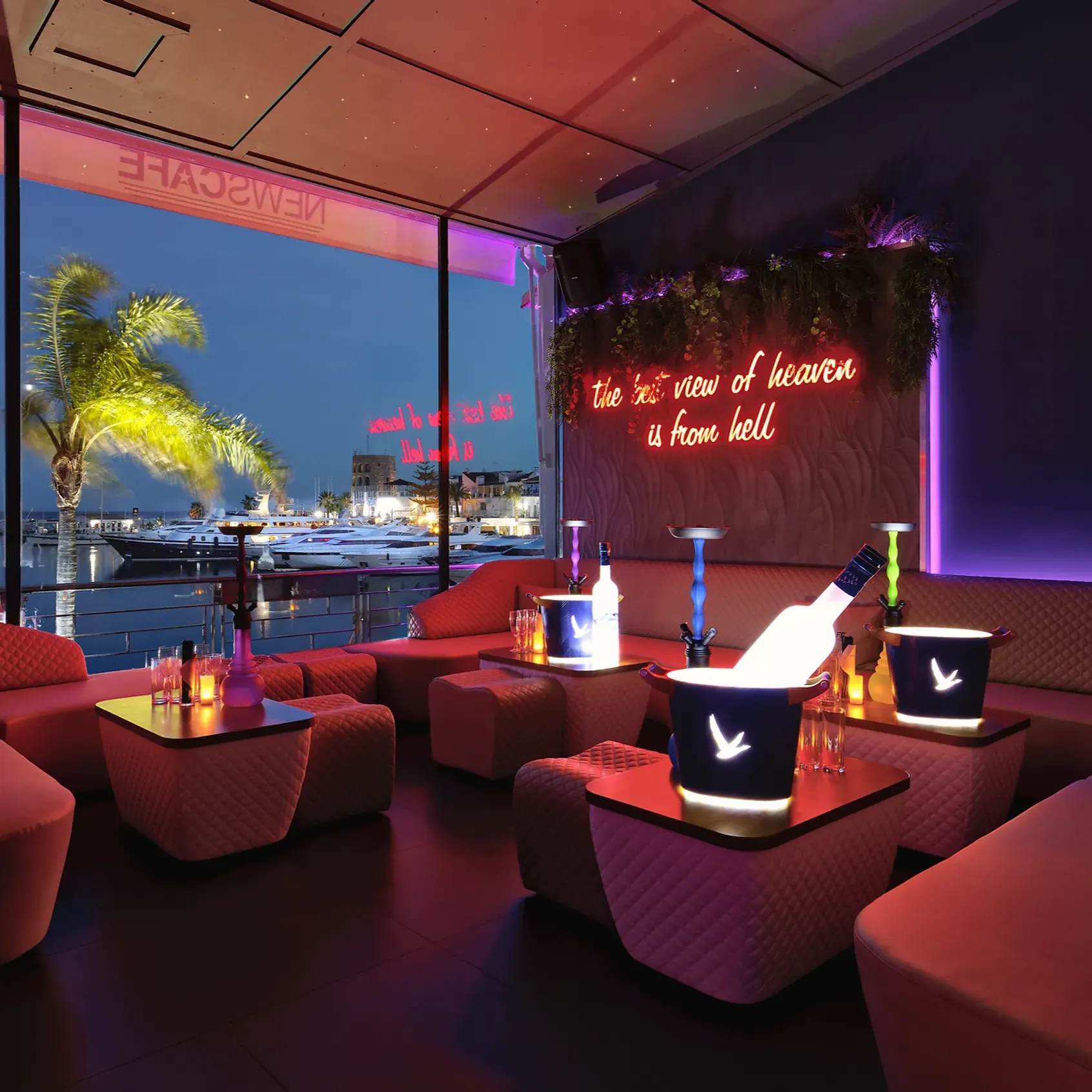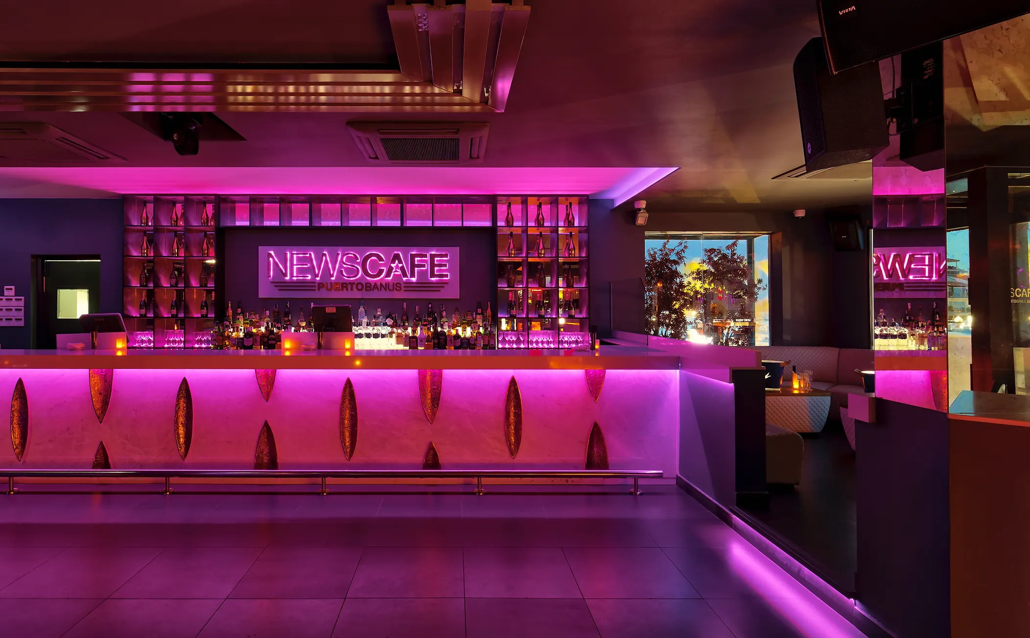 Referente nocturno en la Costa del Sol. Gastronomía selecta y fiestas internacionales con impresionantes zonas VIP. Newscafé se distingue por su ambiente moderno y elegante, con dos terrazas que ofrecen vistas privilegiadas sobre Puerto Banús y sus lujosos yates. Durante el día es un café muy sofisticado, mientras que por la noche se transforma en uno de los bares más vibrantes y concurridos de la zona, atrayendo a una clientela exclusiva.